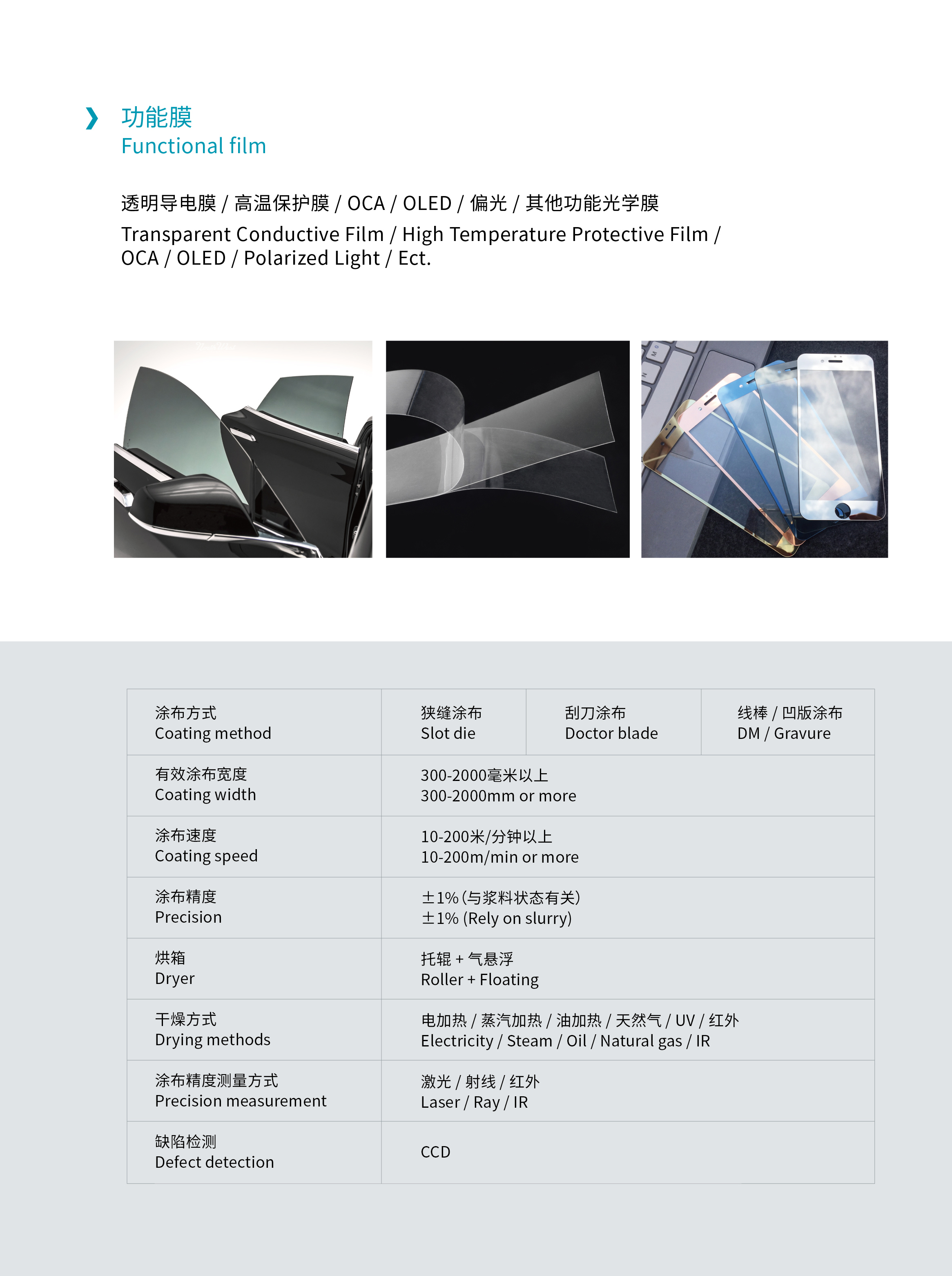 主要用於:硬化塗層薄膜、防反射(AR),低反射(LR)薄膜、各種離型薄膜、鋰電池隔膜、各種底塗(Primer)層薄膜。